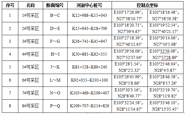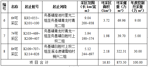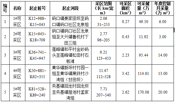 (二)规划河段可采区划定及基本情况表:
