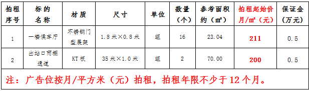 (四)拍租镇雄县开元商业物业服务有限公司以勒高铁站站前广场各类广告位使用权,详见下表: